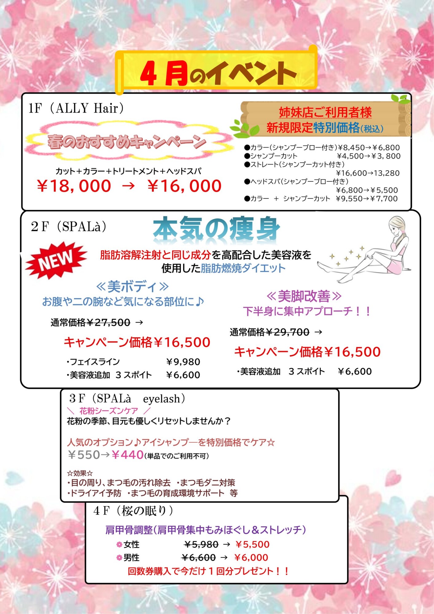 いつも「ALLY Hair」「SPALa」「SPALa Eyelash」「アクティヘアクリニック」「桜の眠り」「颯月めだか」をご利用いただき、誠にありがとうございます😌🙏